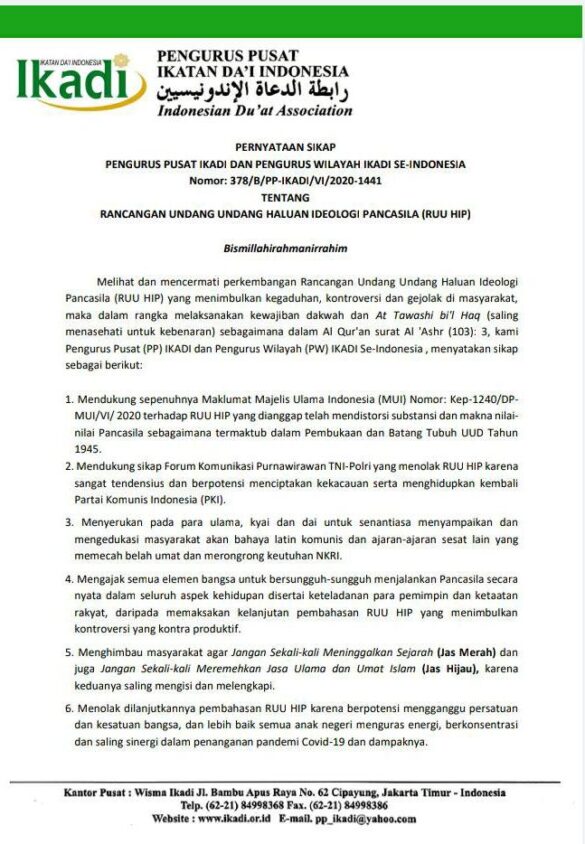 PERNYATAAN SIKAP PENGURUS PUSAT IKADI DAN PENGURUS WILAYAH IKADI SE-INDONESIA Nomor: 378/B/PP-IKADI/VI/2020-1441 TENTANG RANCANGAN UNDANG UNDANG HALUAN IDEOLOGI PANCASILA (RUU HIP) Bismillahirahmanirrahim Melihat…